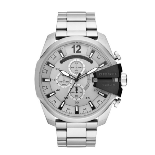 MaterialDiesel DZ4501 This 51mm Mega Chief watch features a silver dial with white stick indexes, chronograph movement, and a stainless steel bracelet. Case Size: 51 mm mm Case Thickness: 15 mm Water Resistance: 10 ATM Case Material: stainless steel Case Finish: matte